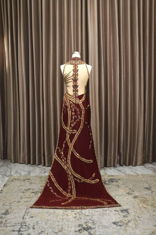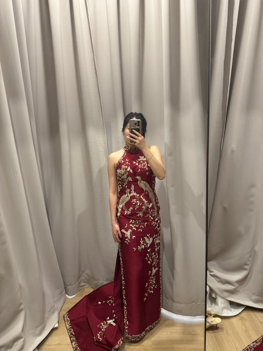 Cheongsam | Stella Lunardy - Red Halter Cheongsam with Birds Embroideries